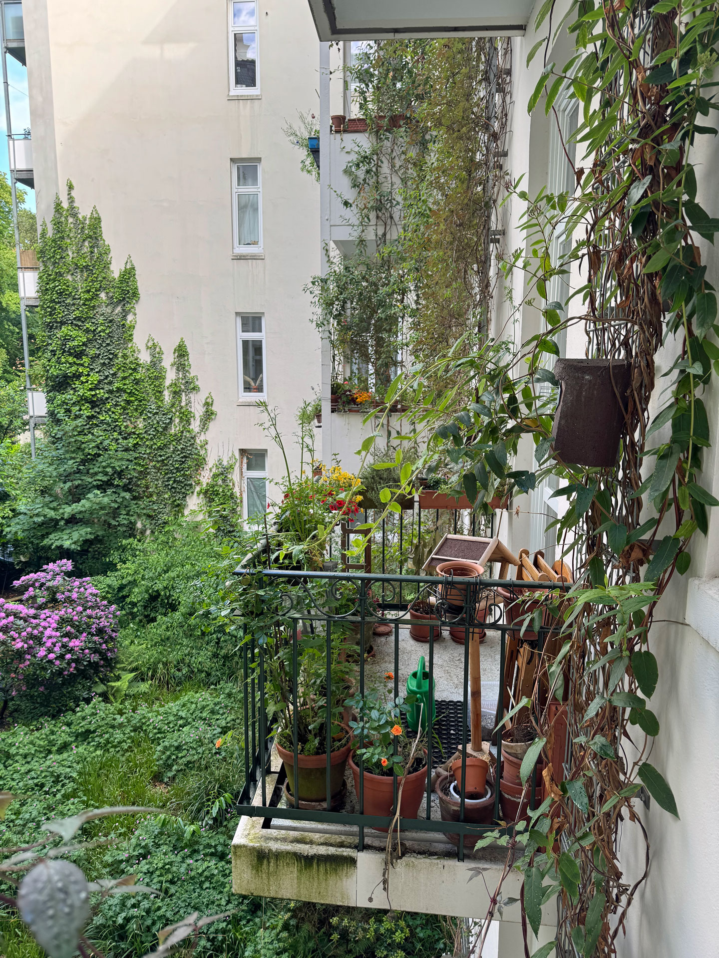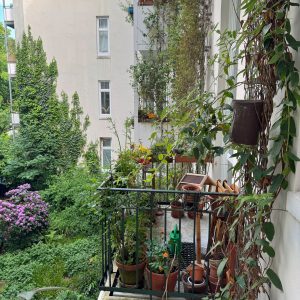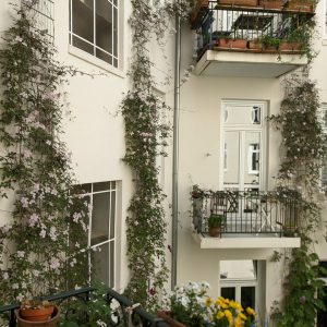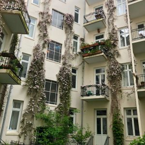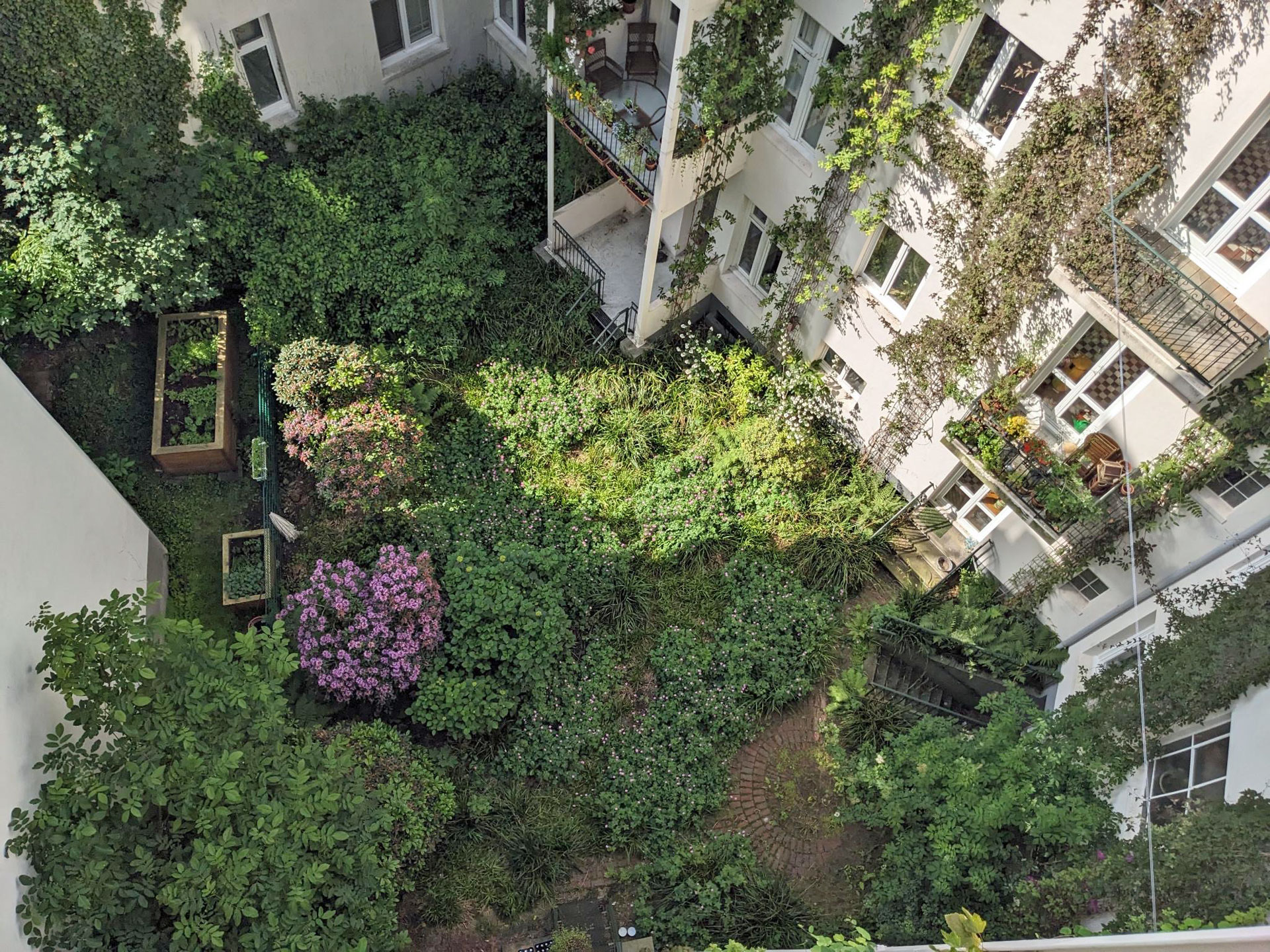Was kaum jemand weiß: Auf der Rückseite des Hauses Hayn-/Hegestraße befindet sich ein grünes Idyll, ein gärtnerisch gestalteter Innenhof, mit Wildblumenwiese und Kletteranlagen für Rankgewächse, die Vögeln und Insekten eine Heimat bieten und Einfluss auf das Mikroklima nehmen.